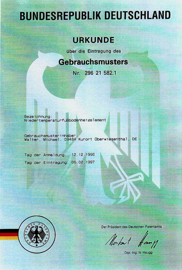 1995 wurde das entwickelte Produkt als Gebrauchsmuster beim Deutschen Patentamt in München angemeldet, geprüft und unter der Nummer 29621582.1 eingetragen.